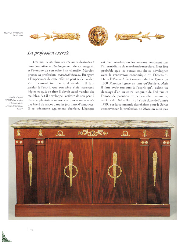 Cet ouvrage de 240 pages avec 350 illustrations couleurs et N.B. présente Pierre-Benoît Marcion (1769 - 1840) l'un des principaux ébénistes fournisseurs de Napoléon.