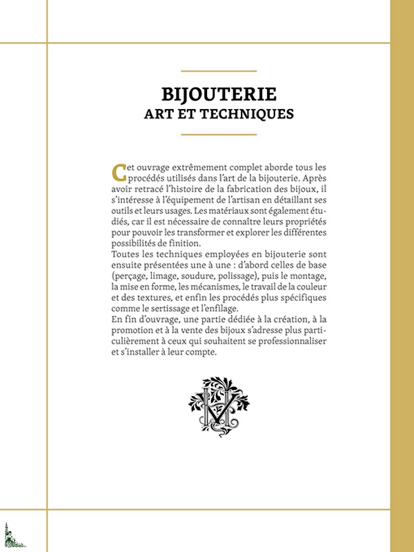 This comprehensive book shows step by step the main techniques and materials used to create jewelry. It is both a guide and technical manual, for professionals and amateurs who want to hear to practice this art. Processes, materials and creation are detailed in a clear and comprehensive way.